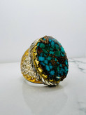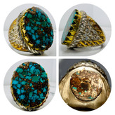 انگشتر فیروزه شجر گل کاسنی رگه سرخ آبی کاربنی سبز،نگین کهنه و قدیمی، تراش سنگ تخت و صاف