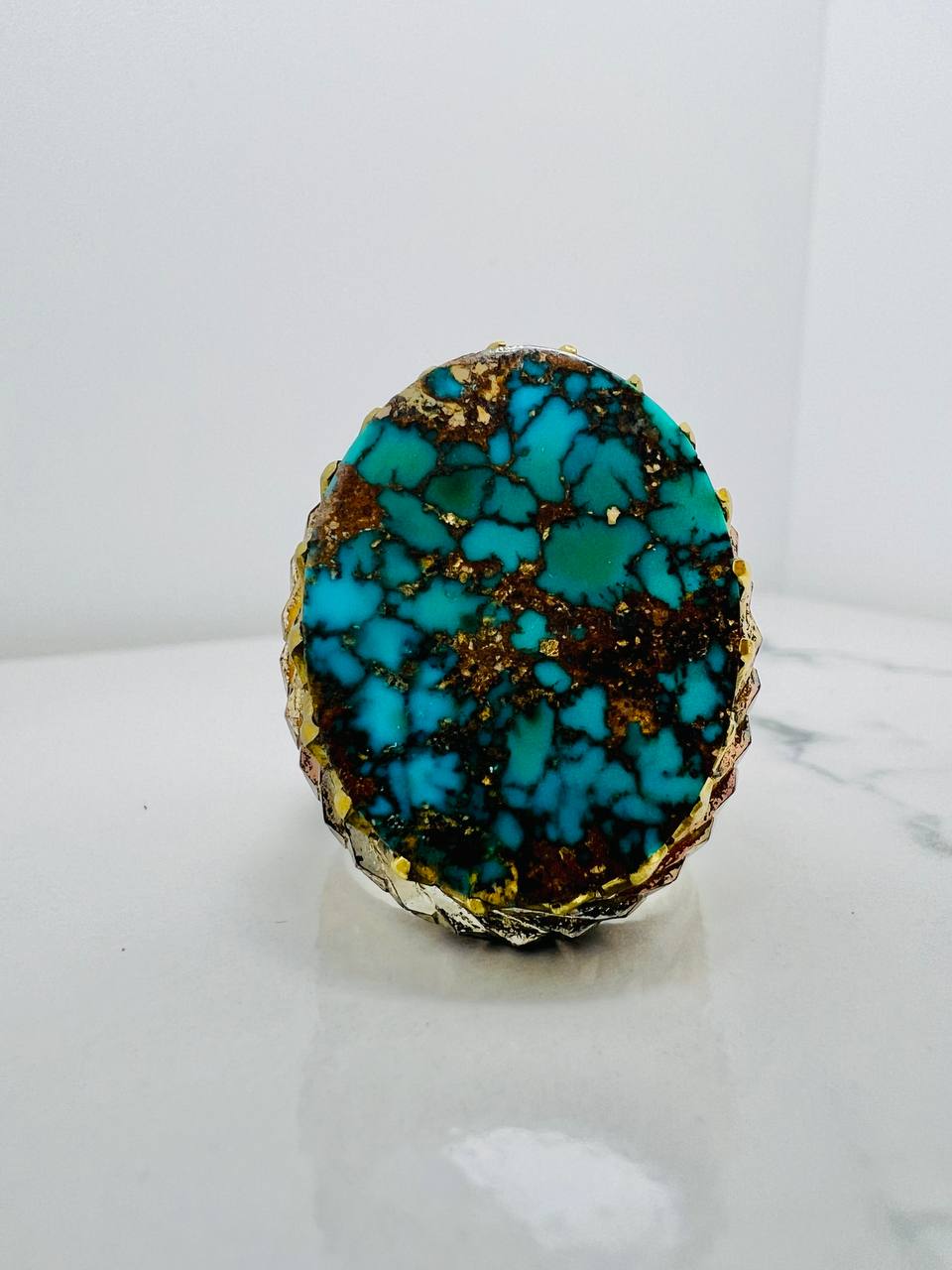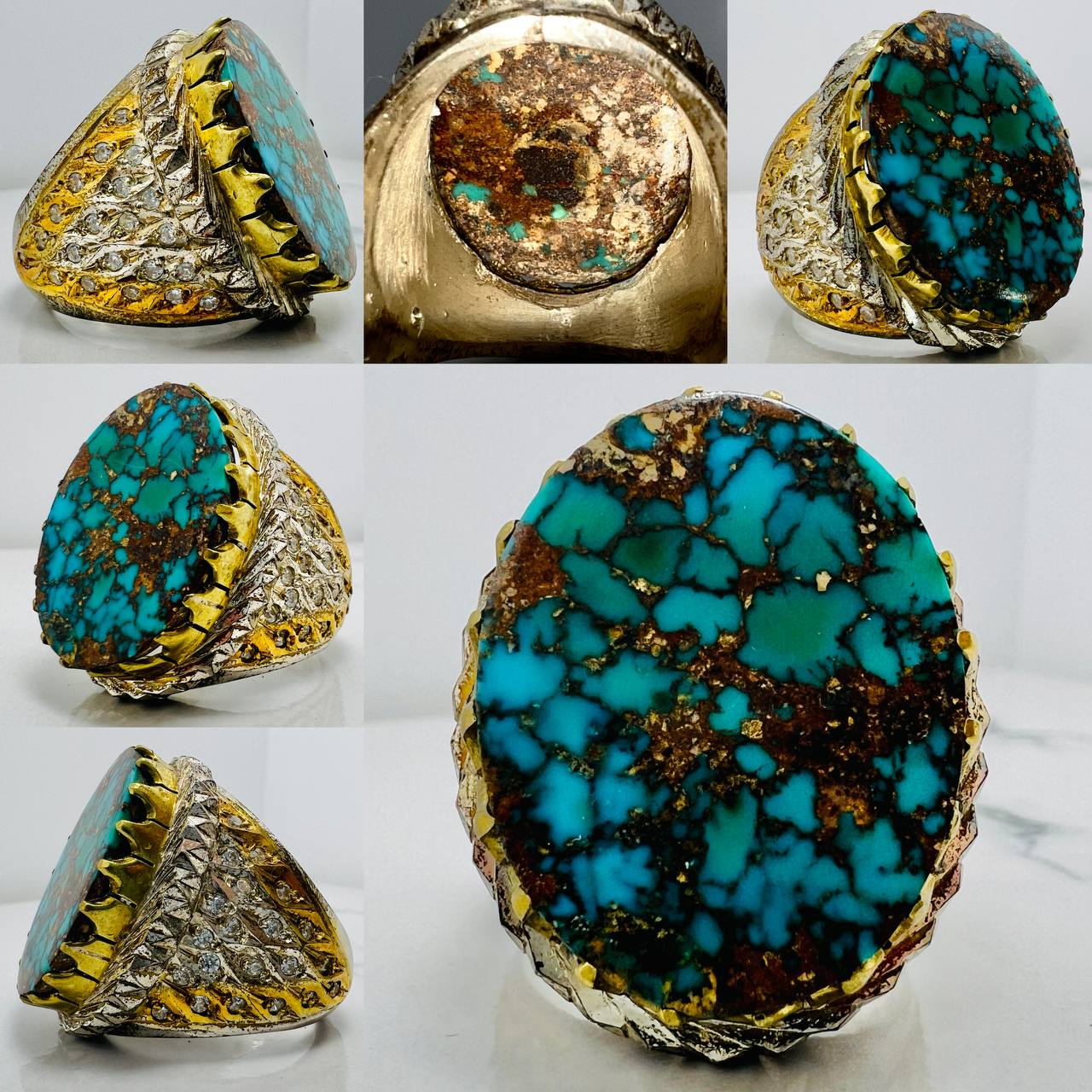 انگشتر فیروزه شجر گل کاسنی رگه سرخ آبی کاربنی سبز،نگین کهنه و قدیمی، تراش سنگ تخت و صاف