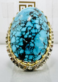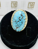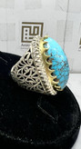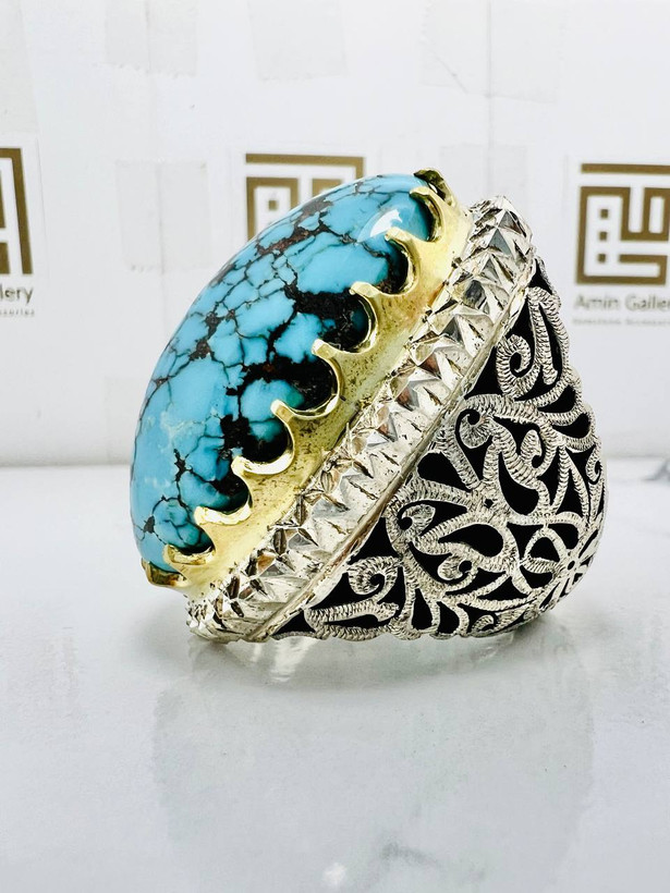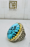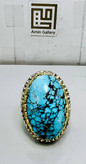 انگشتر فیروزه شجر عنکبوتی،ذات سنگ سیاه،شجر دوپوست،تراش دامله بادومی قواره درشت،مغز سنگ،نگین کهنه و قدیمی،رنگ آبی محک کاربنی