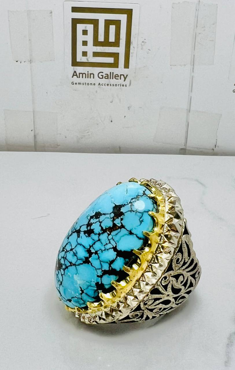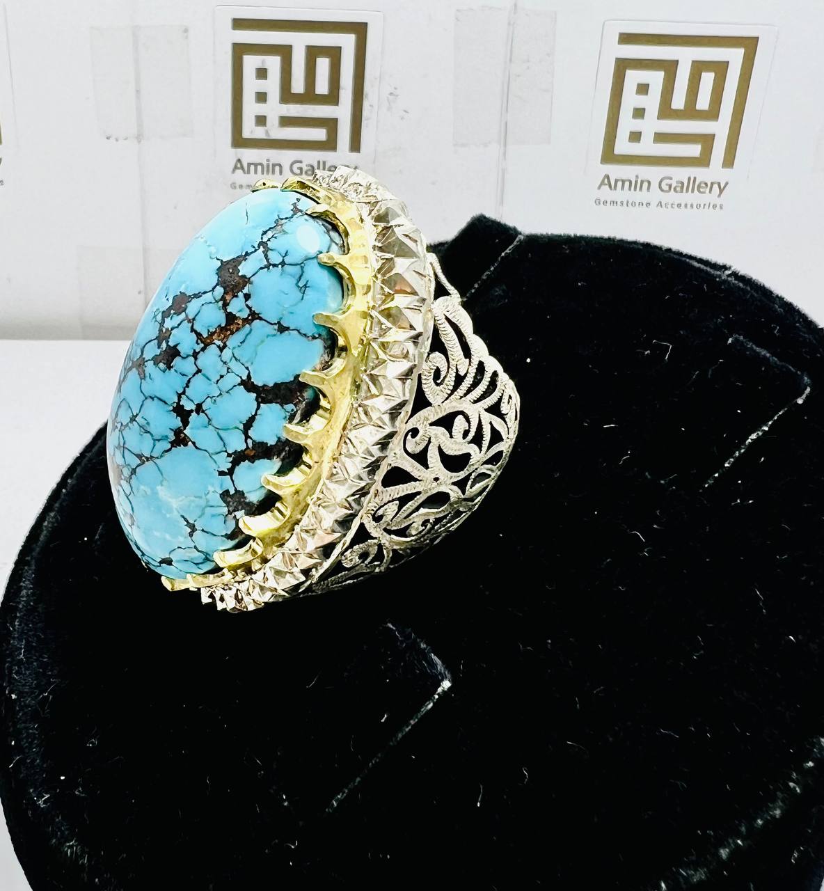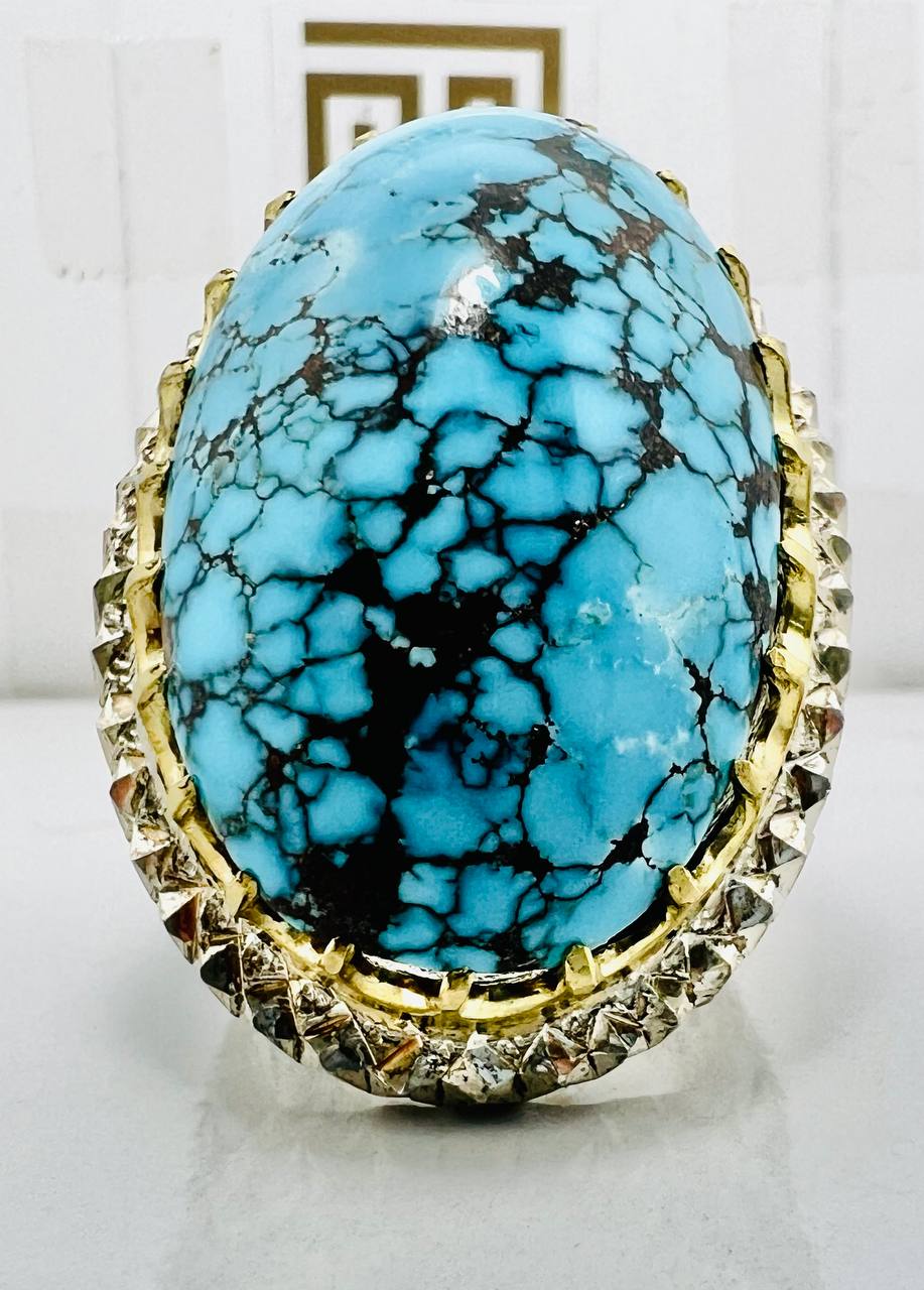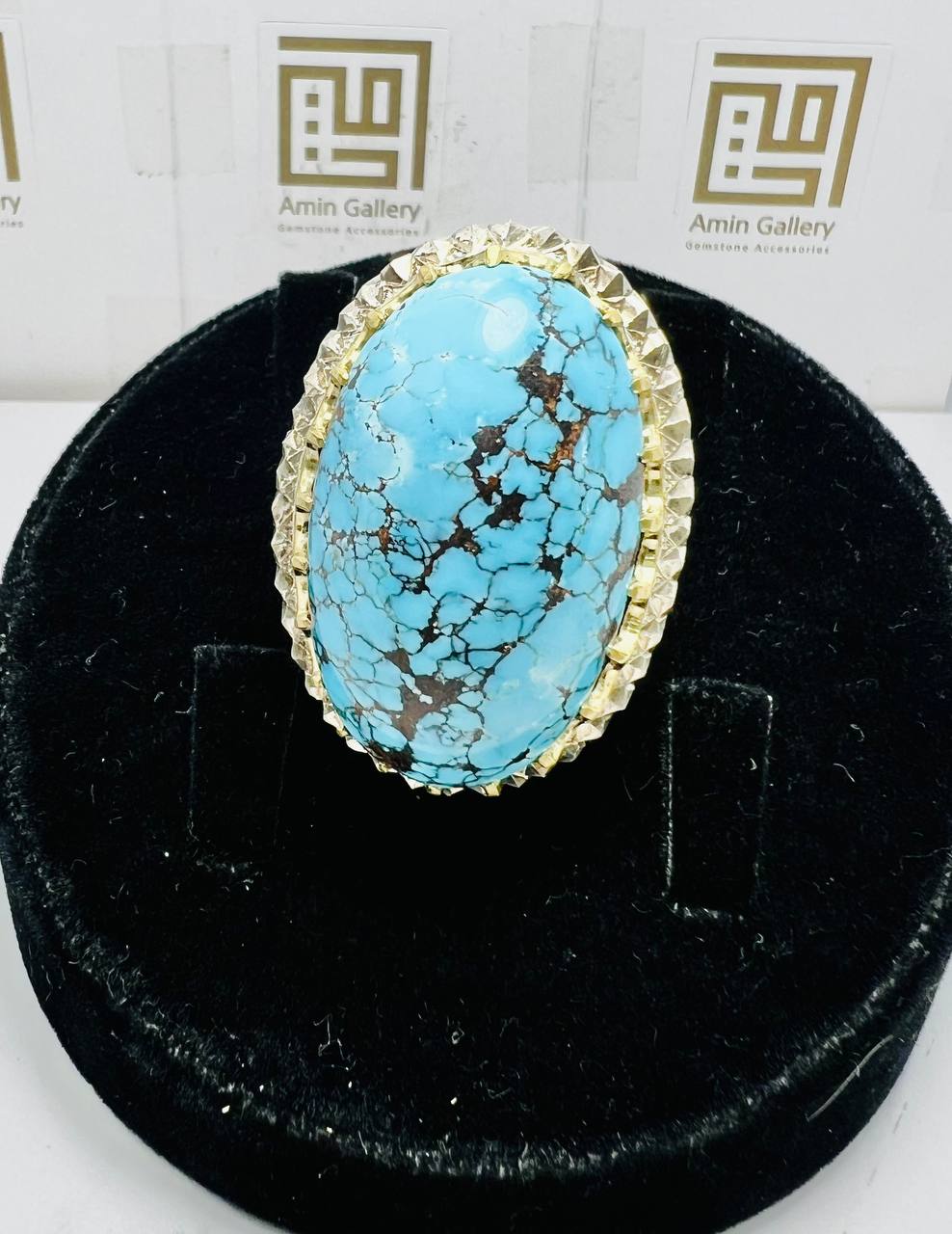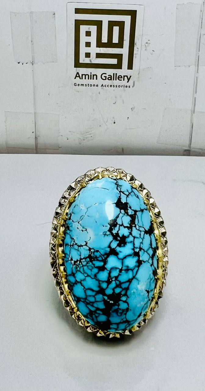 انگشتر فیروزه شجر عنکبوتی،ذات سنگ سیاه،شجر دوپوست،تراش دامله بادومی قواره درشت،مغز سنگ،نگین کهنه و قدیمی،رنگ آبی محک کاربنی