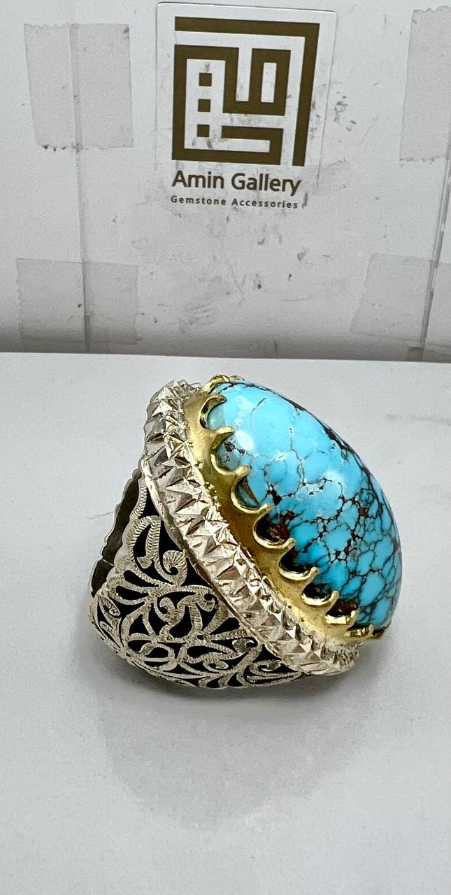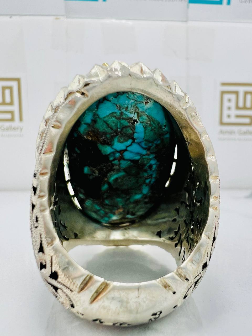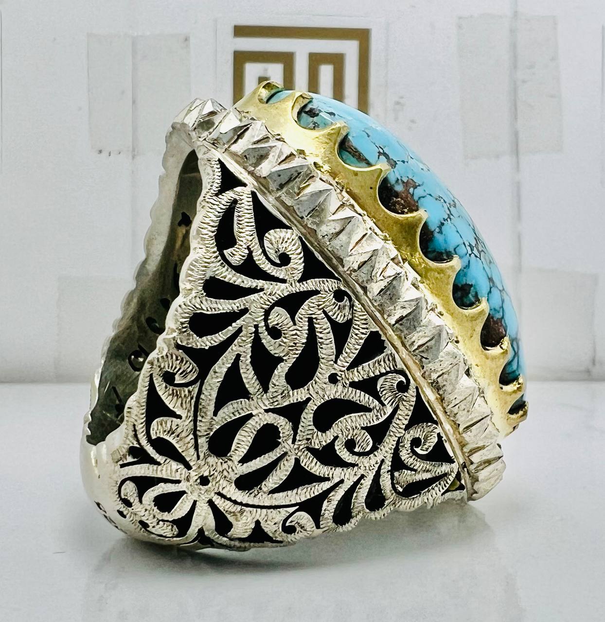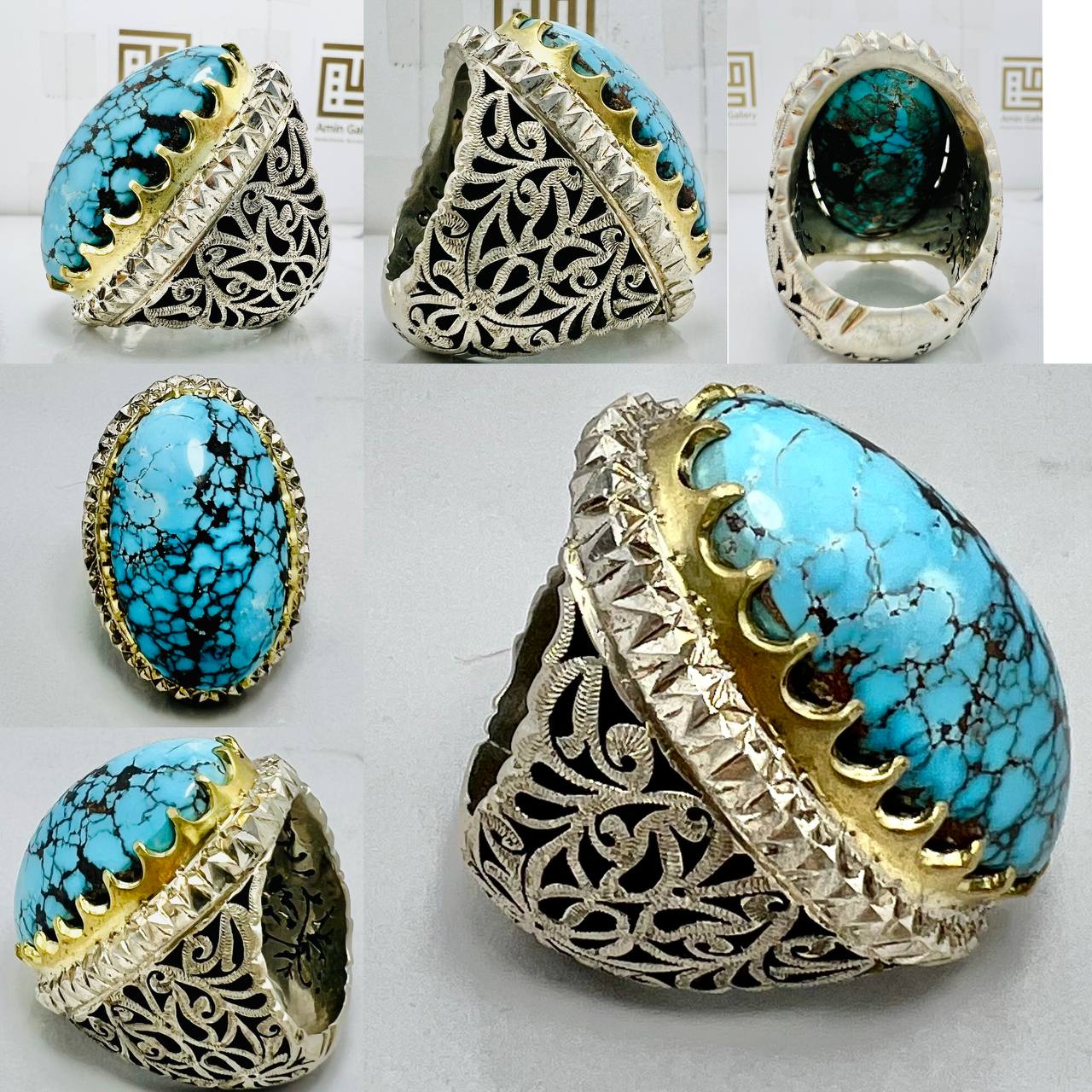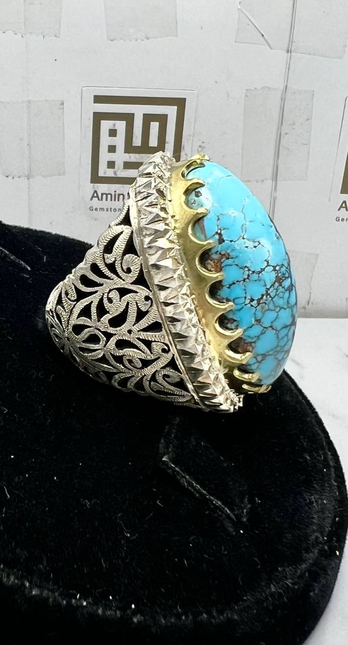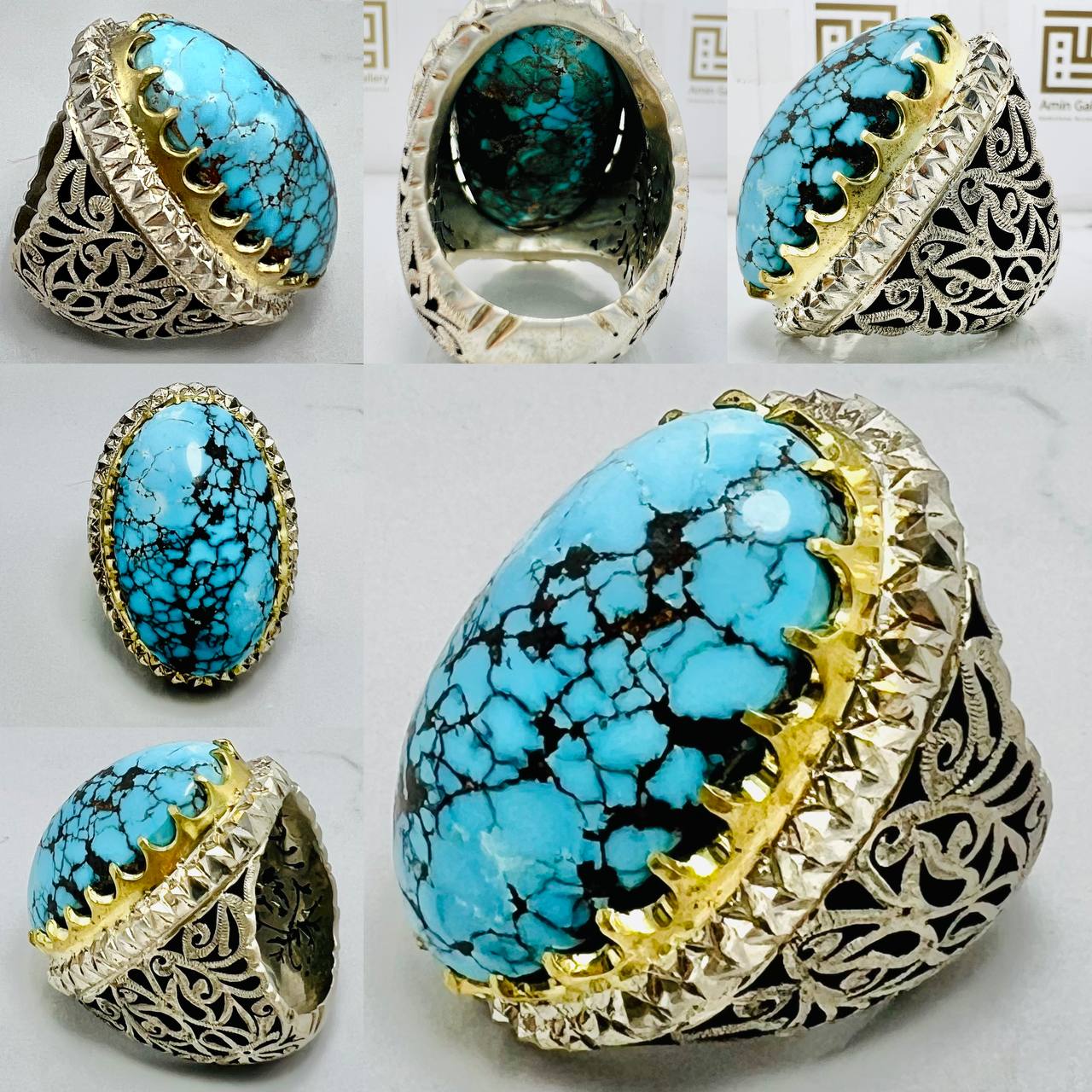 انگشتر فیروزه شجر عنکبوتی،ذات سنگ سیاه،شجر دوپوست،تراش دامله بادومی قواره درشت،مغز سنگ،نگین کهنه و قدیمی،رنگ آبی محک کاربنی