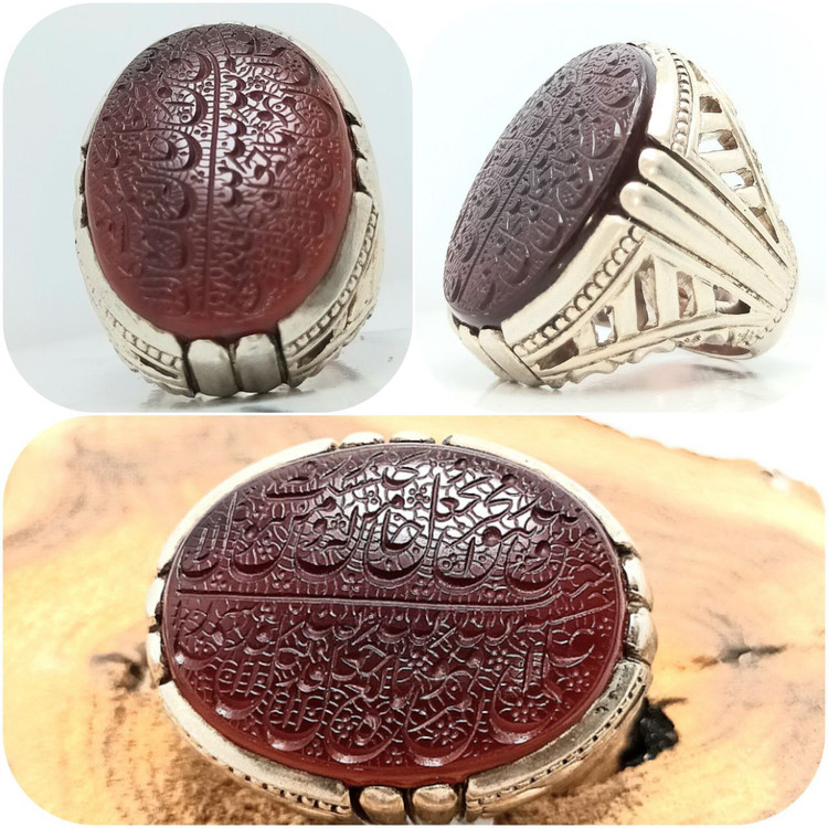 انگشتر عقیق کهنه یمنی رنگ خونی و قرمز ، خوش رنگ و لعاب ، حکاکی استاد حسن بیگی(حرز)