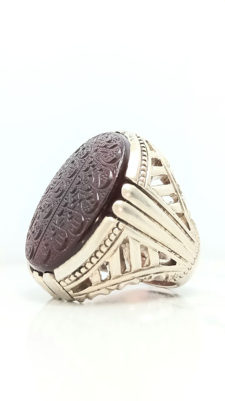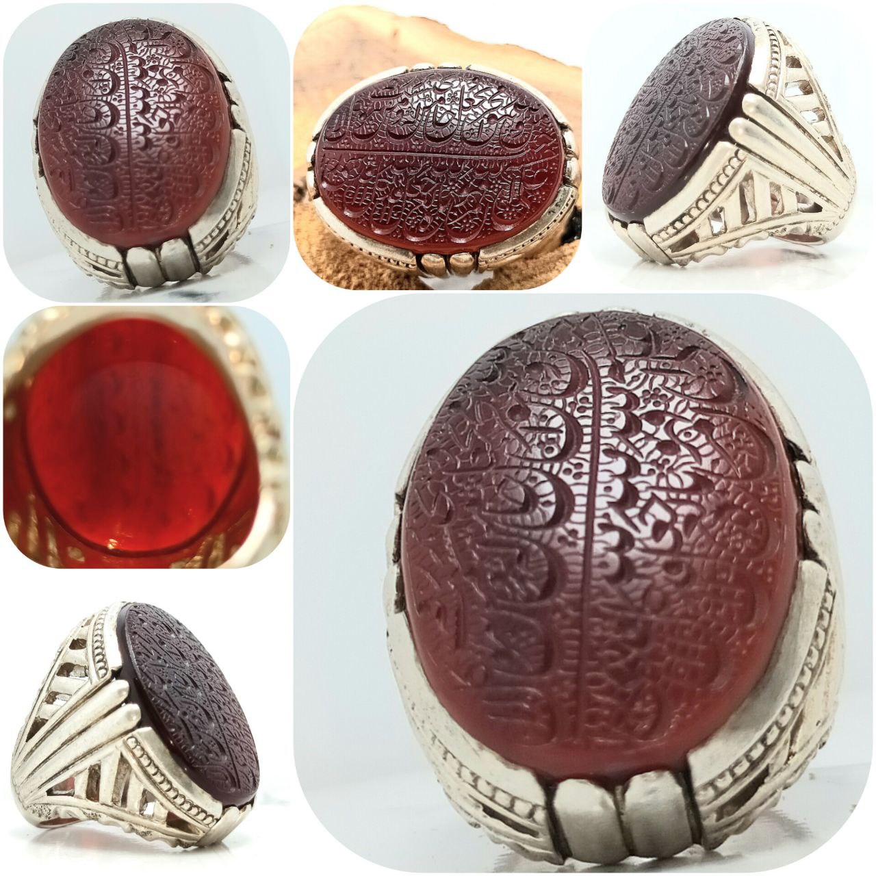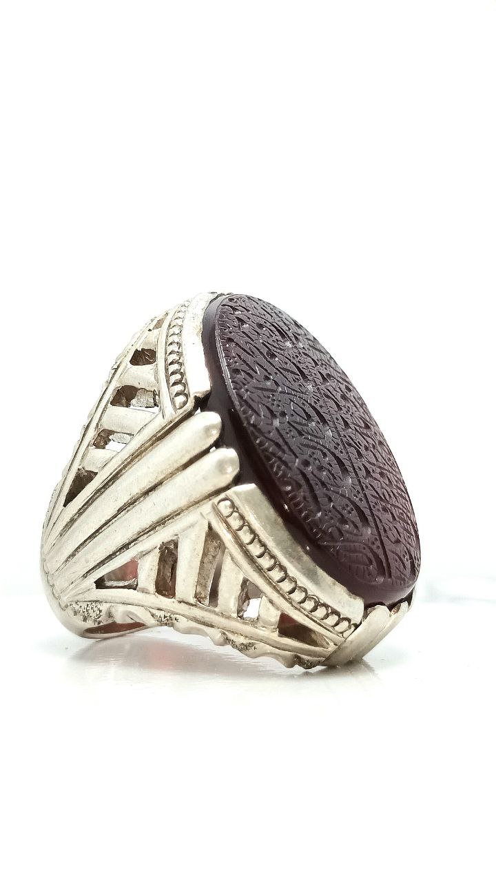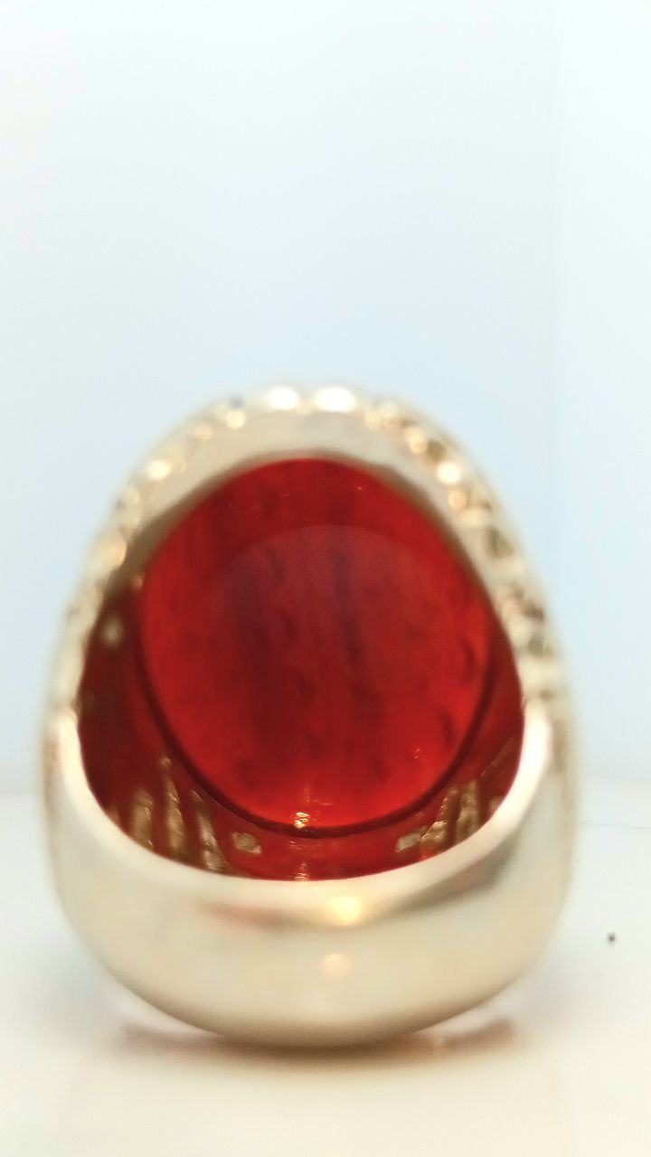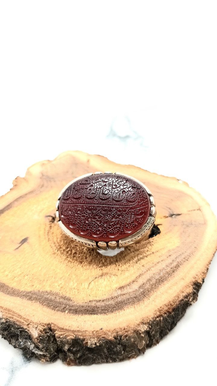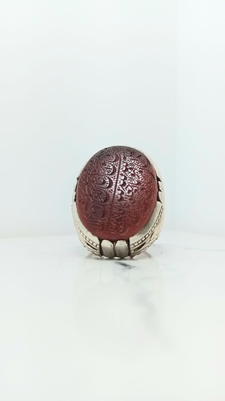 انگشتر عقیق کهنه یمنی رنگ خونی و قرمز ، خوش رنگ و لعاب ، حکاکی استاد حسن بیگی(حرز)