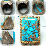 انگشتر فیروزه شجر رگه طلایی، رنگ آبی کاربنی، مغز سنگ ، ذات سنگ شجر طلای با رگه های منظم و استثنایی و بی همتا، سنگ کهنه و قدیمی،تراش سنگ ۶ ضلعی تلویزیونی