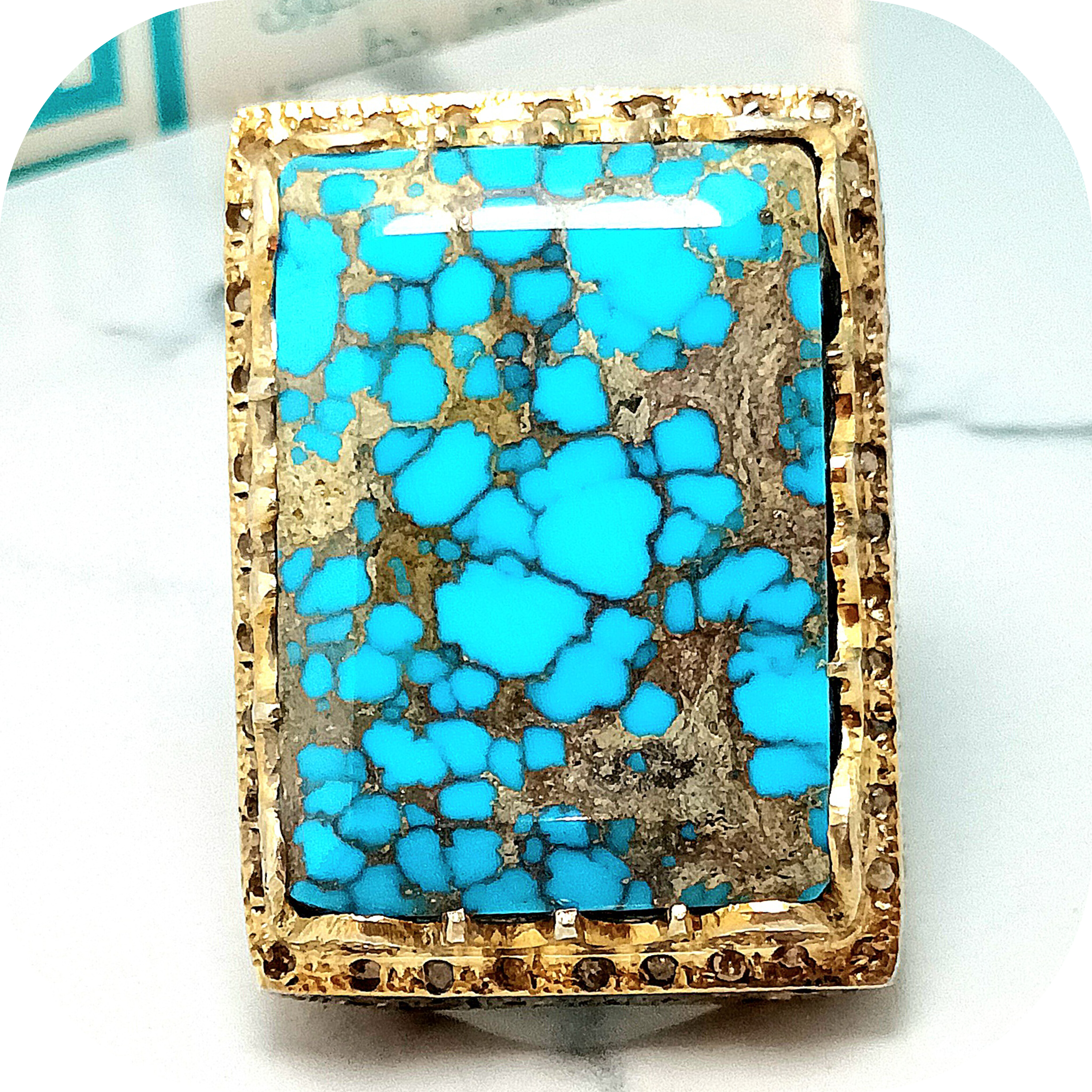 انگشتر فیروزه شجر رگه طلایی، رنگ آبی کاربنی، مغز سنگ ، ذات سنگ شجر طلای با رگه های منظم و استثنایی و بی همتا، سنگ کهنه و قدیمی،تراش سنگ ۶ ضلعی تلویزیونی