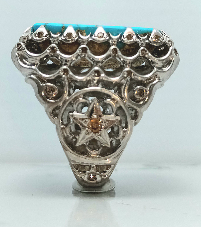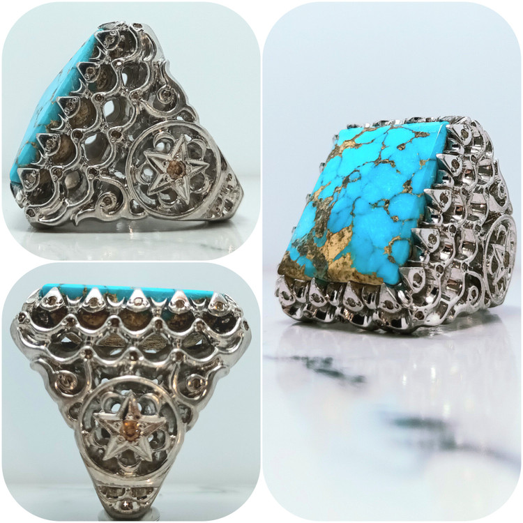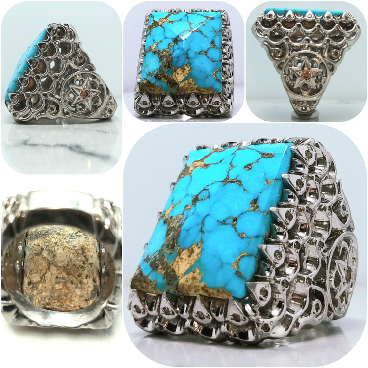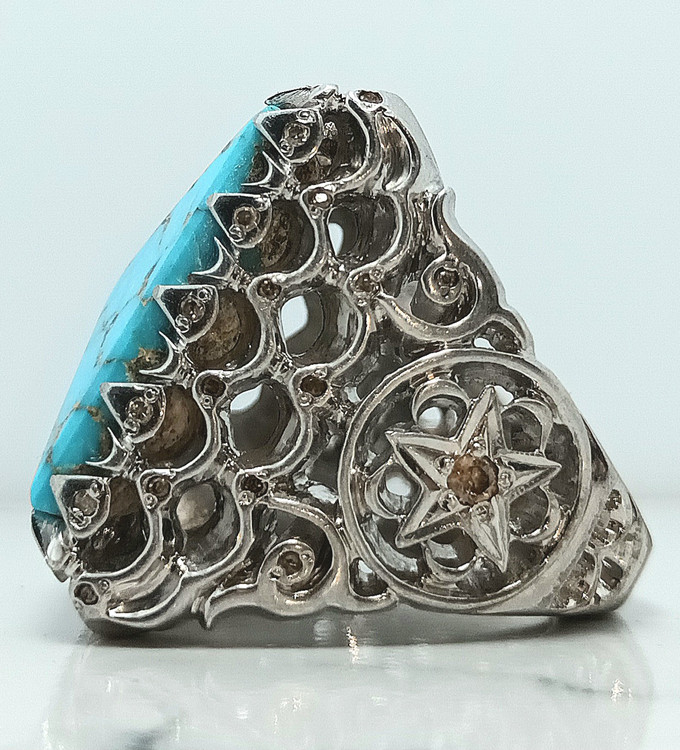 مدل رکاب پولکی درشت، با چنگهای منظم و مخراج کاری شده، دور تا دور الماس های طبیعی و رنگی، و دوتا ستاره مخراج کاری شده دو طرف رکاب