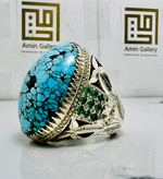 انگشتر سنگ فیروزه دو پوست مغز سنگ ذات سنگ سیاه با رگه های سیاه تراش نیمه دامله بادومی قواره درشت