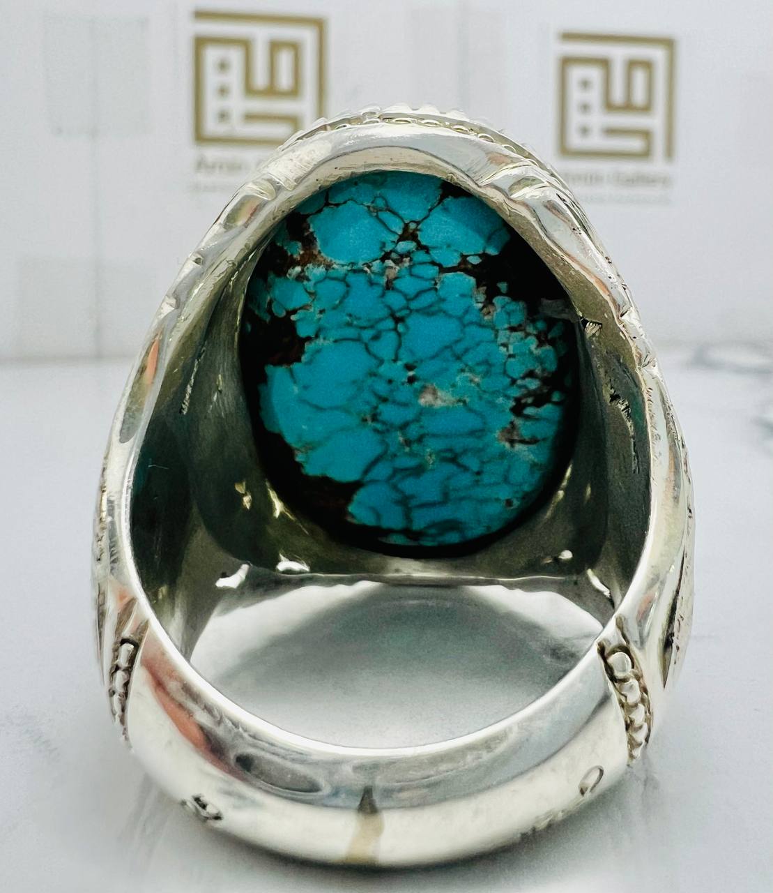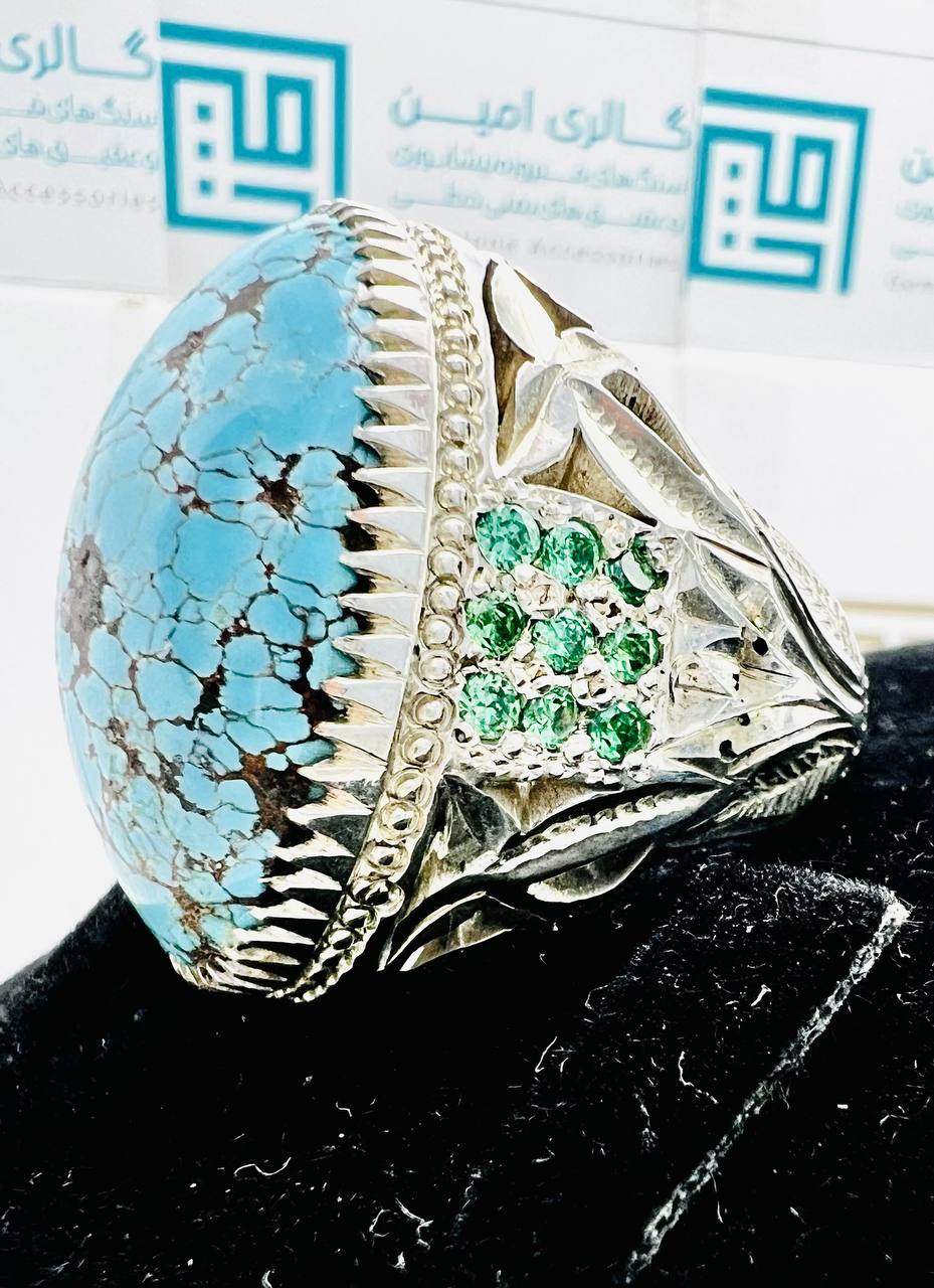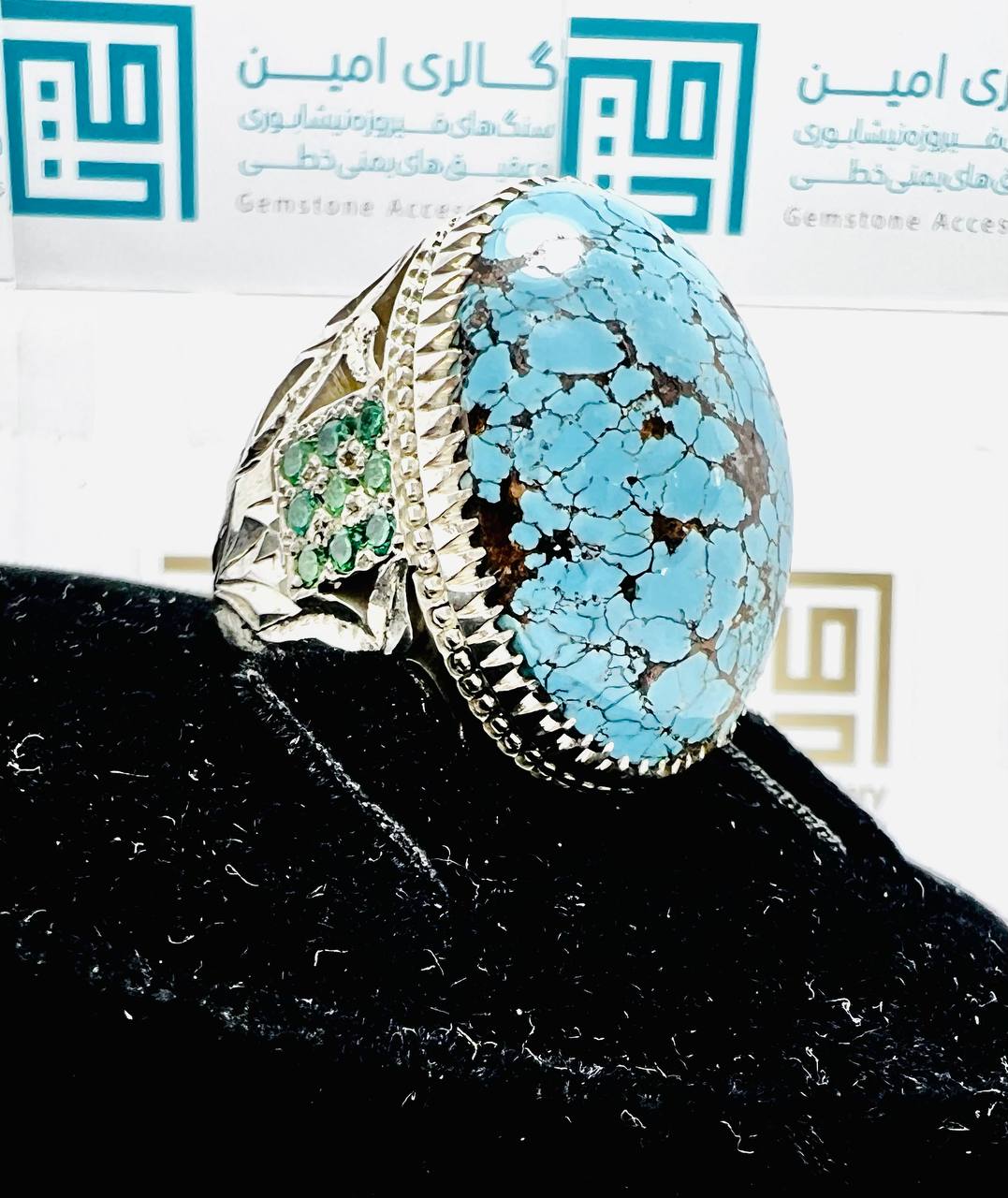انگشتر سنگ فیروزه دو پوست مغز سنگ ذات سنگ سیاه با رگه های سیاه تراش نیمه دامله بادومی قواره درشت