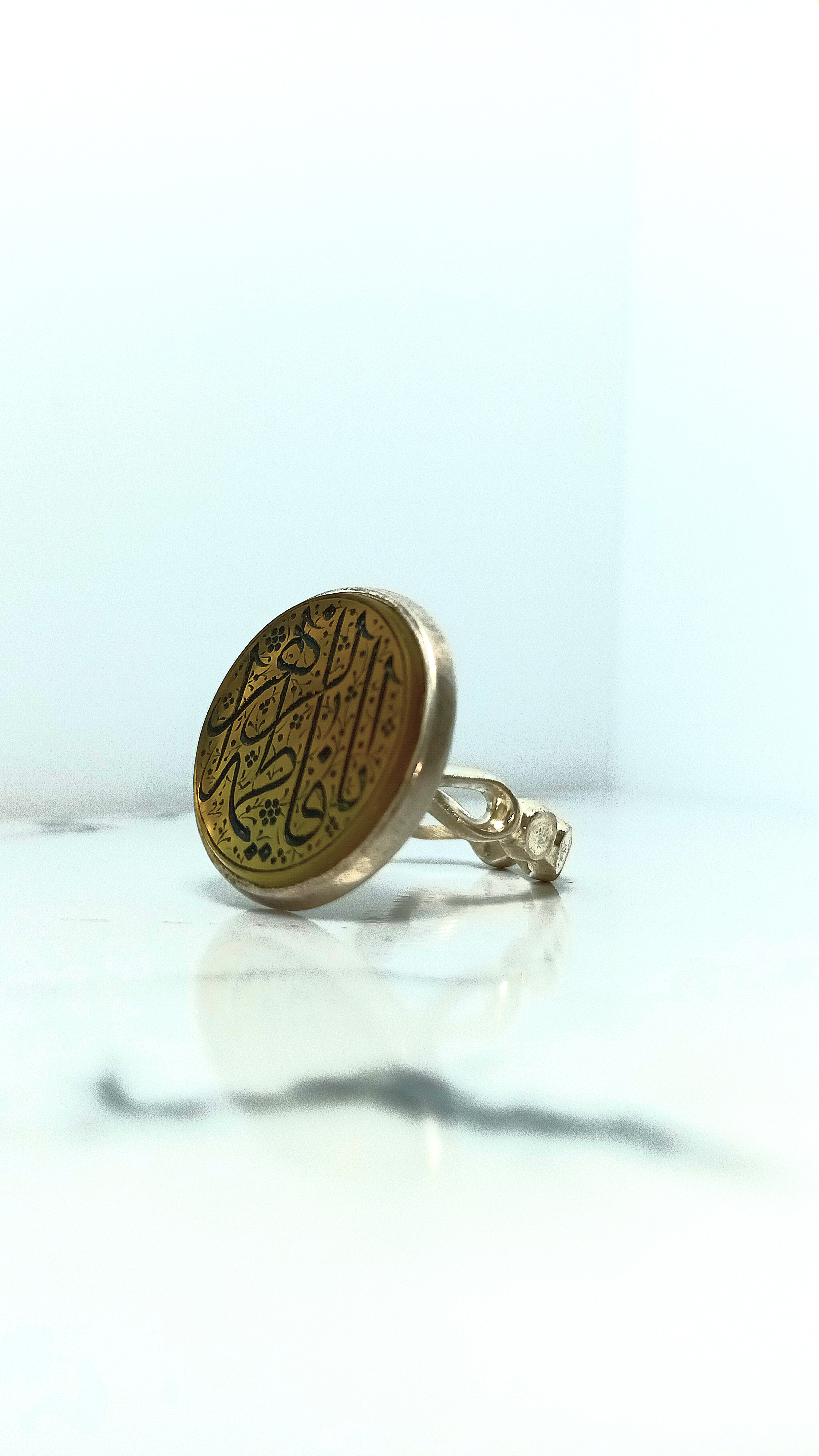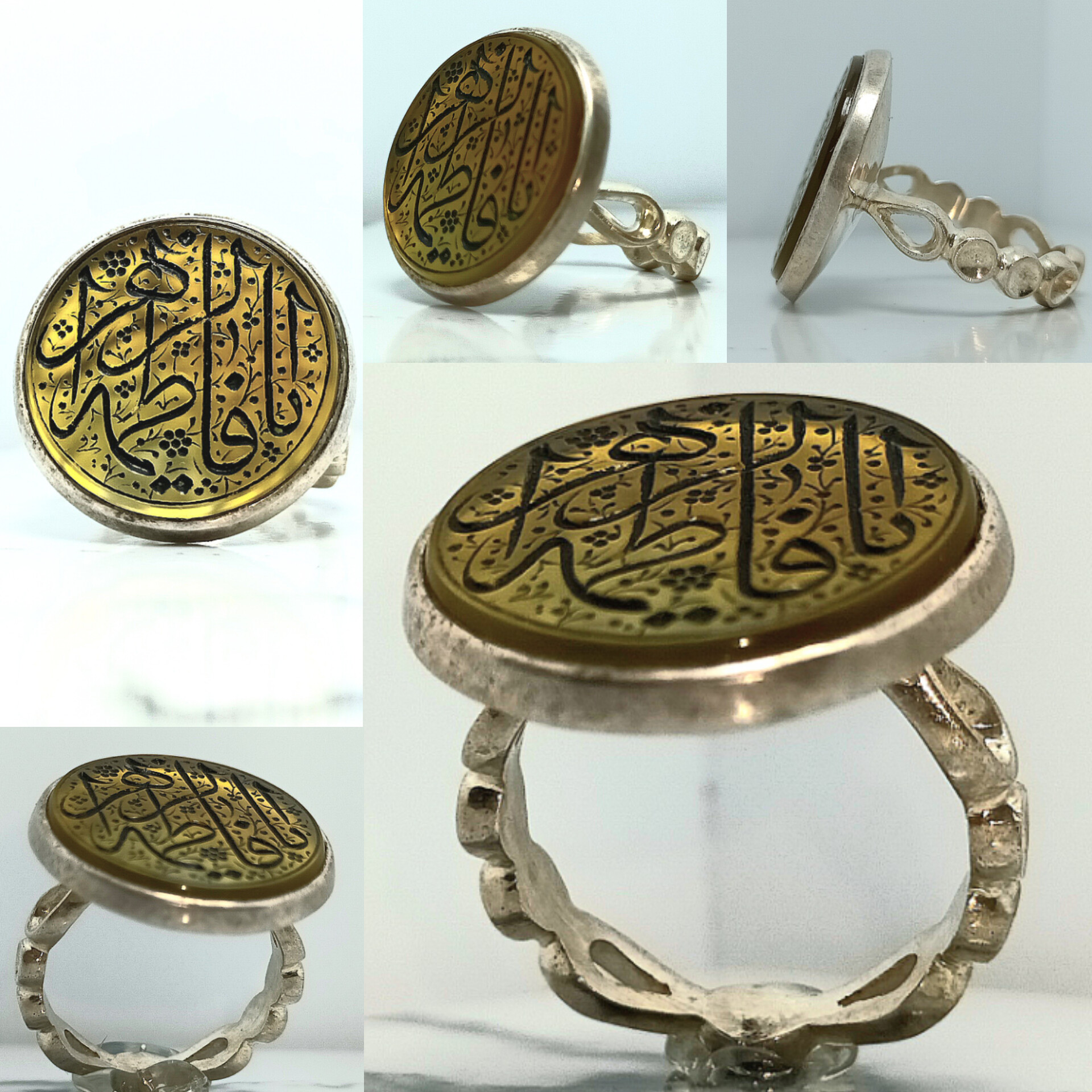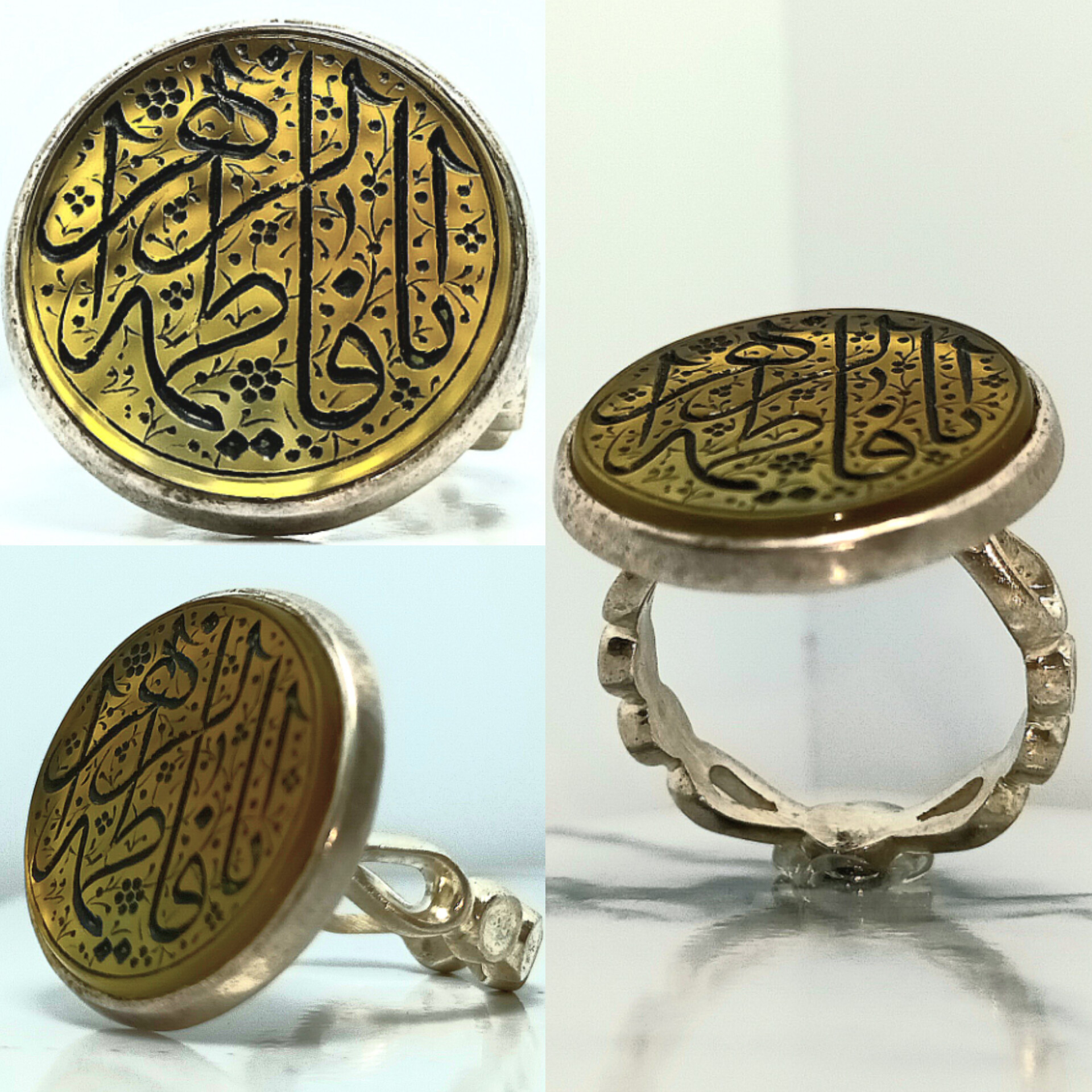 عقیق زرد کهنه و قدیمی بدون امضا ، خط قدیمی، ذکر یا فاطمه الزهرا با حرز امام حسین