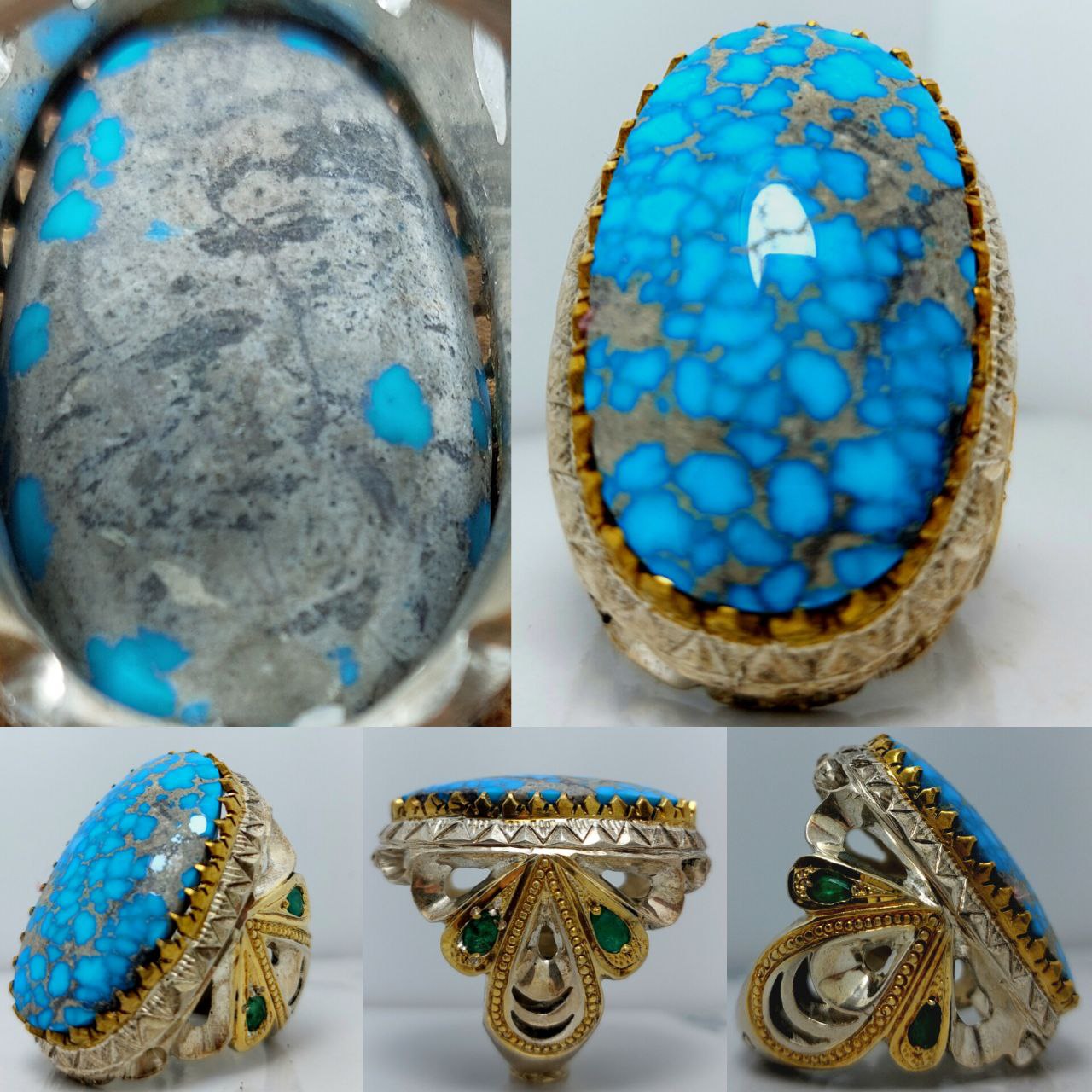 فیروزه شجر با رگه هایی با رنگ خاص، با نقشه منحصربفرد،تراش نیمه دامله،بادومی قواره درشت، کهنه و قدیمی، ذات سنگ سیاه سنگ