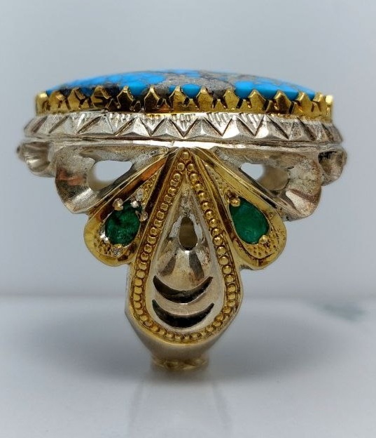 مخراجکاری شدهو مزین با الماس سبز طبیعی اشکی و دو الماس سفید دو طرف سنگ
