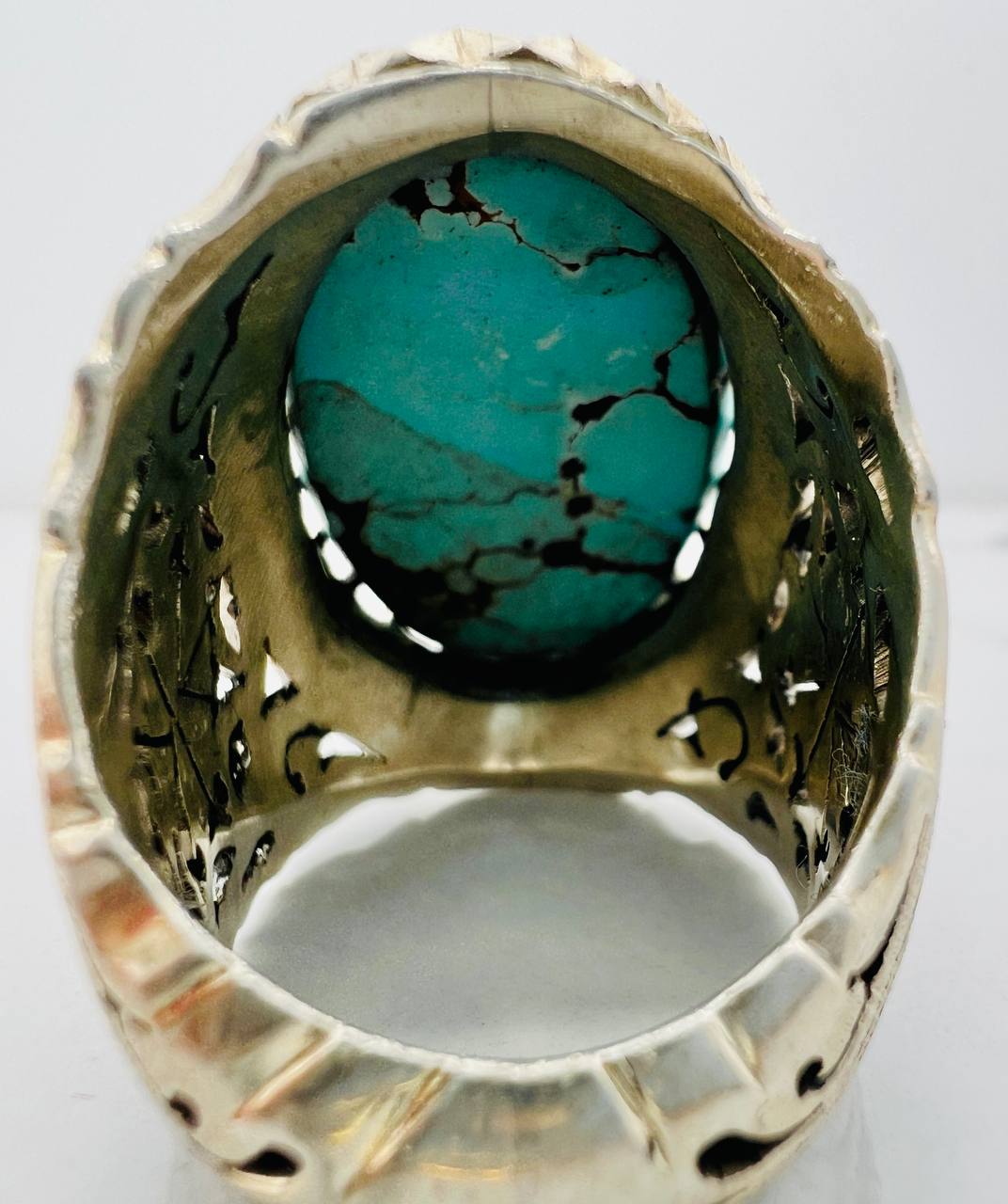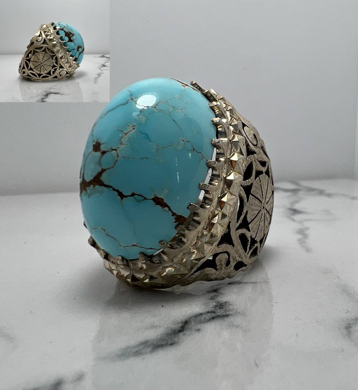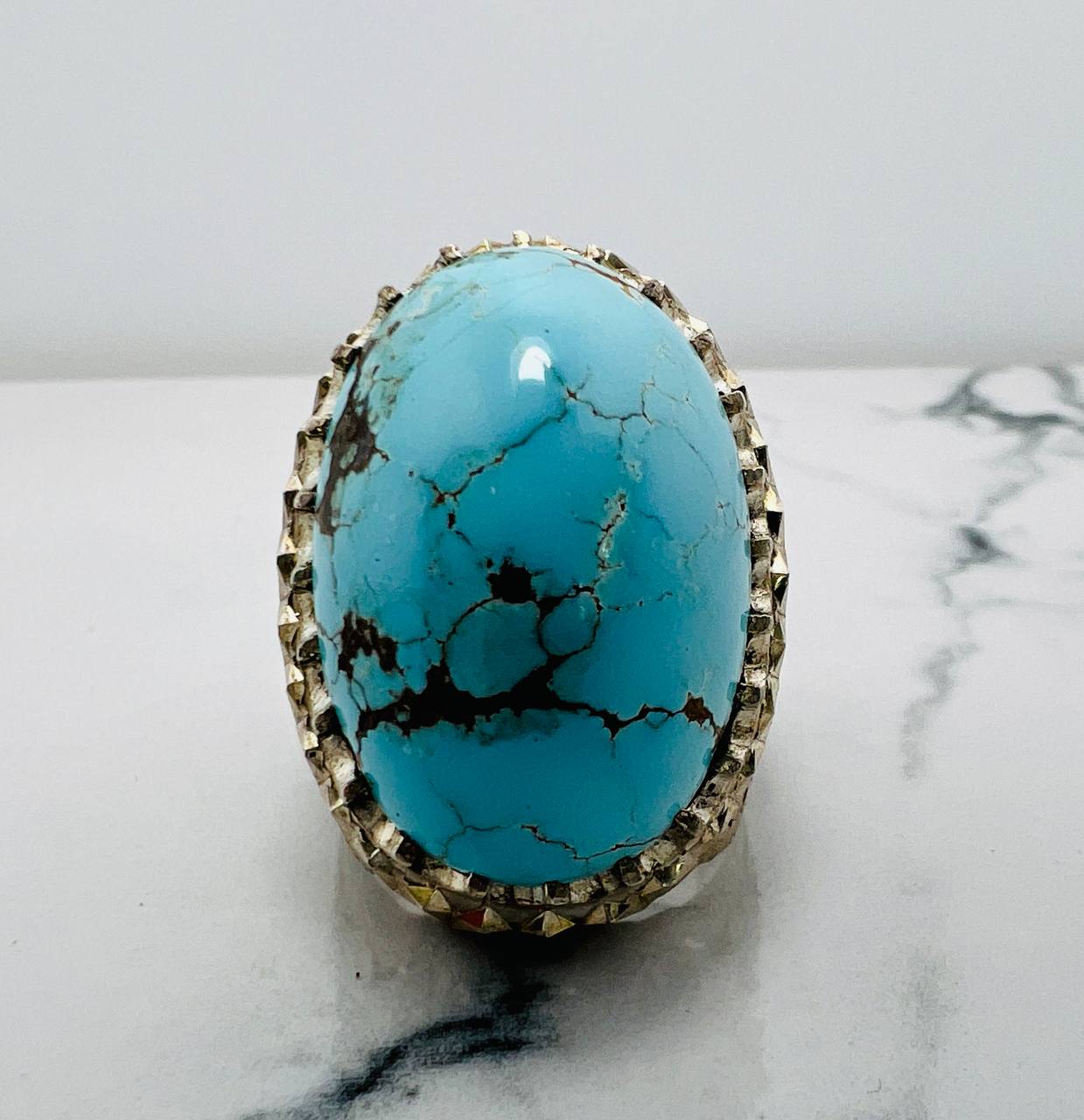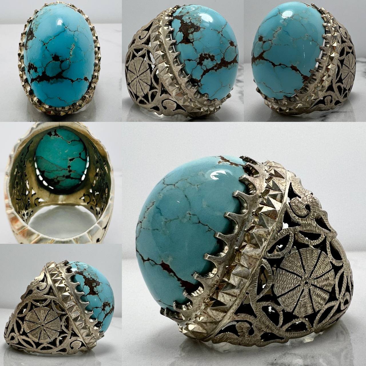انگشتر فیروزه دو پوست، مغز سنگ ، سیاه سنگ ذات سنگ سیاه، تراش سنگ دامله گنبدی، نگین کهنه و قدیمی