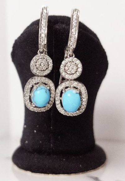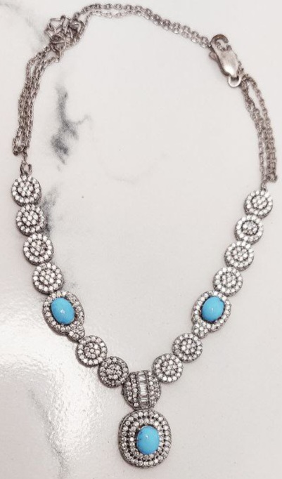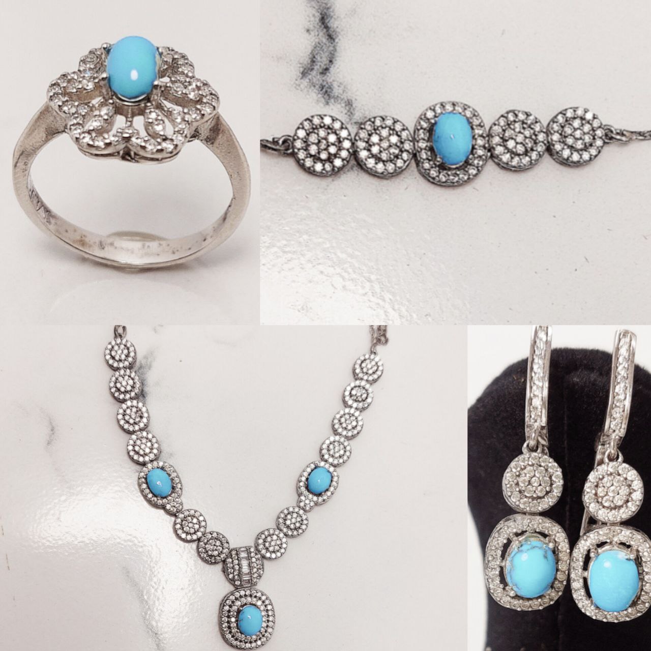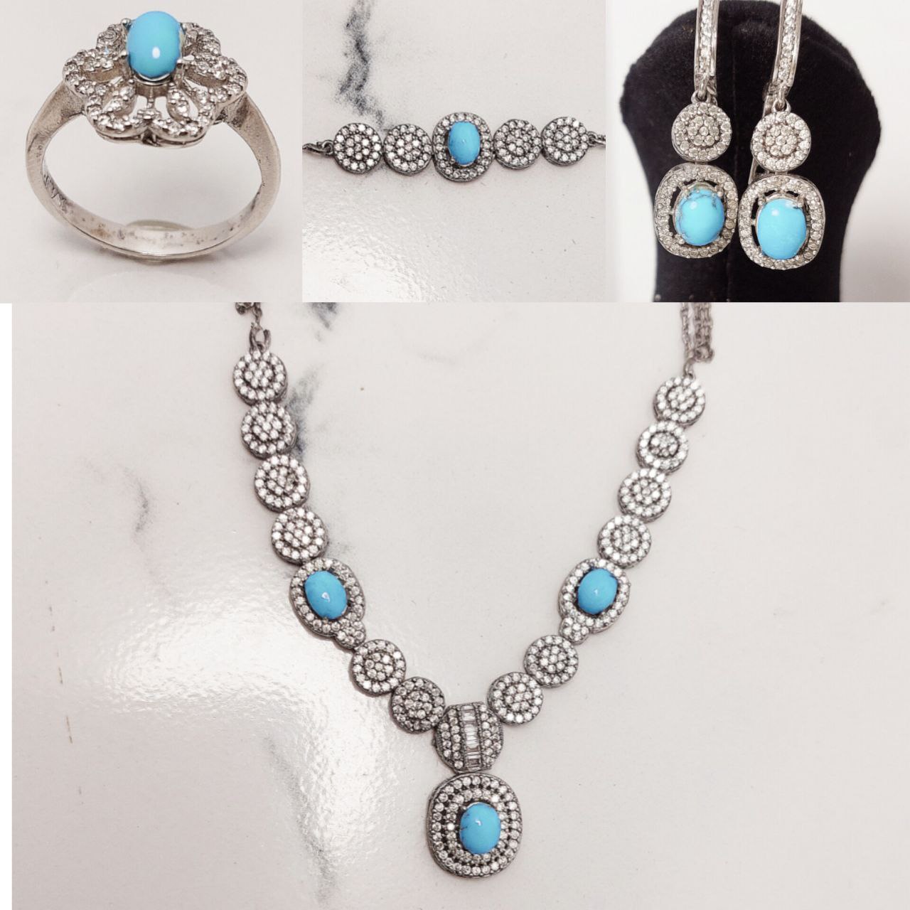 سرویس زنانه فیروزه عجم، کاملا دستساز و تمام نقره با عیار۹۲۵، مخراجکاری شده، آب رادیوم خورده